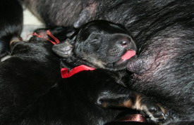 Cara 2 meseca Sredi dopoldneva pa začivka gsm in oznani, da je prišlo sporočilo. Pogledam. Preberem. In sama sebi kar ne verjamem: 3 samci in 5 samic, vsi črni z oznakami, poleženi danes zjutraj, vsi o.k., lp Erika. Seveda se vsi razveselimo! A mene hkrati prešine misel: »5 samic-do sedaj še nikoli ni bilo 5 samic… Hmmm…pri Bellfastu je bilo v leglu 5 samcev…in tam sem tudi izbrala prva…hmmm«